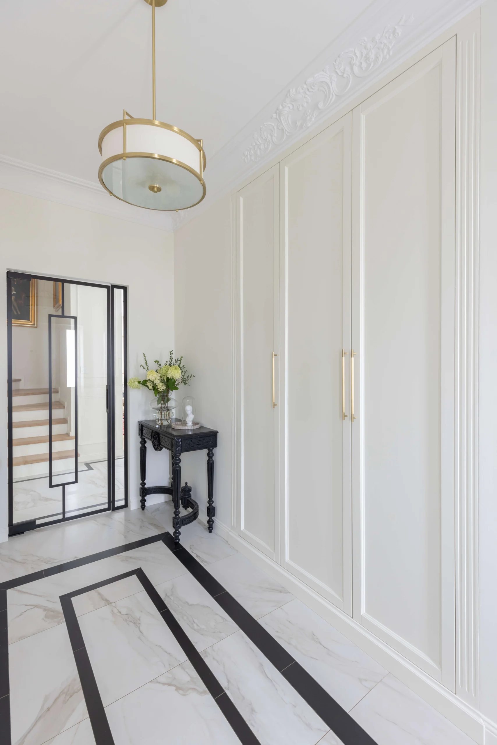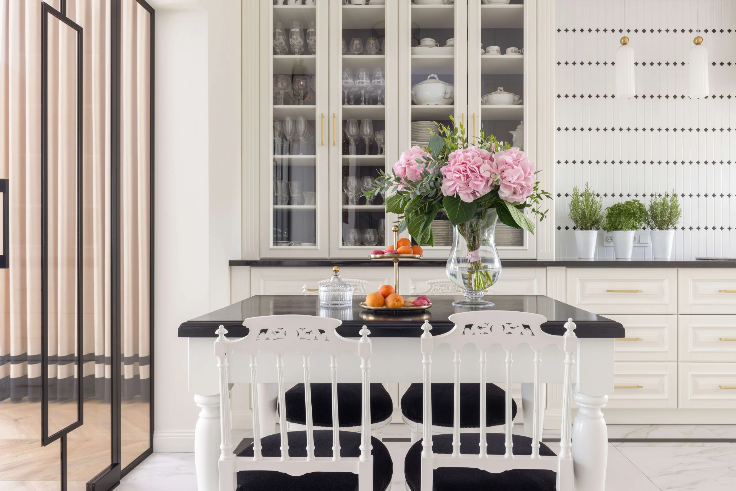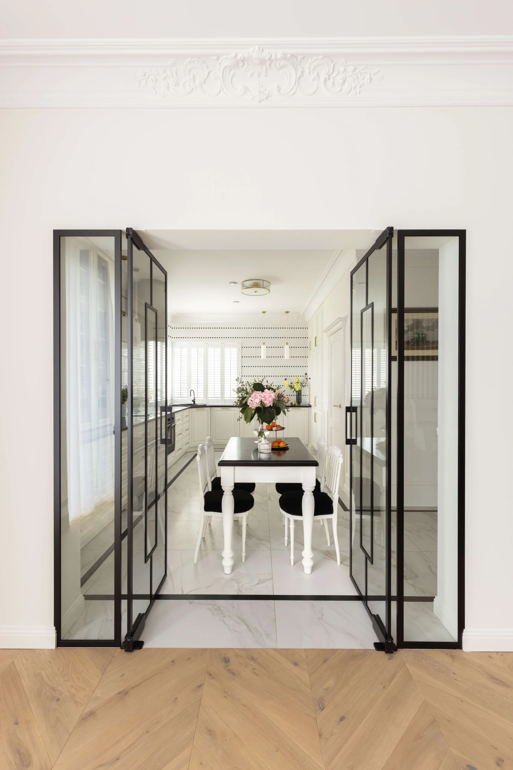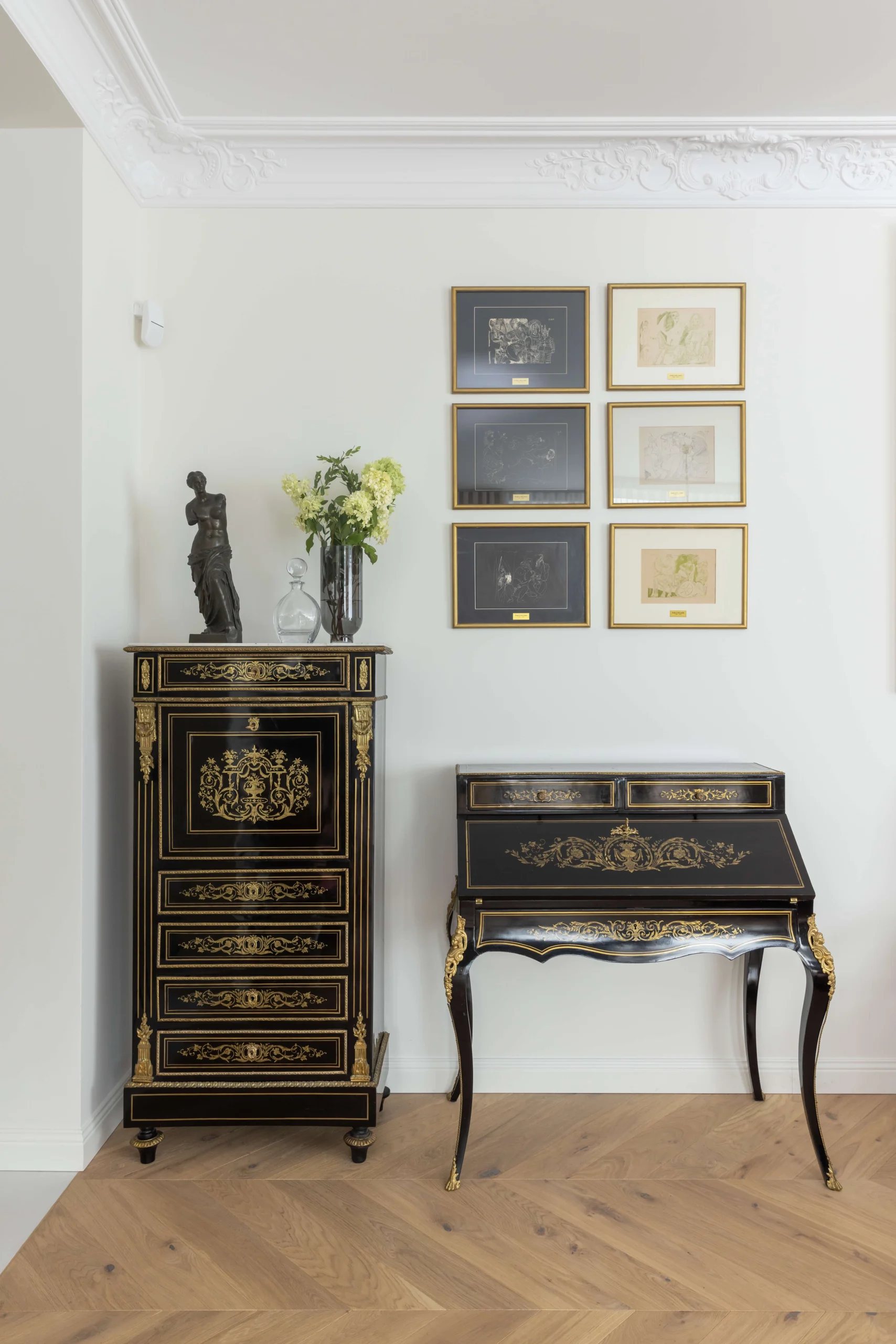 Dom kolekcjonera sztuki, w którym całe wnętrze zostało zaprojektowane w klasycznych odcieniach czerni i bieli, harmonijnie współgrających z zabytkowymi meblami i dziełami sztuki. Każdy element przestrzeni jest starannie dopasowany, podkreślając elegancję oraz wyjątkowy charakter unikatowej kolekcji właściciela.