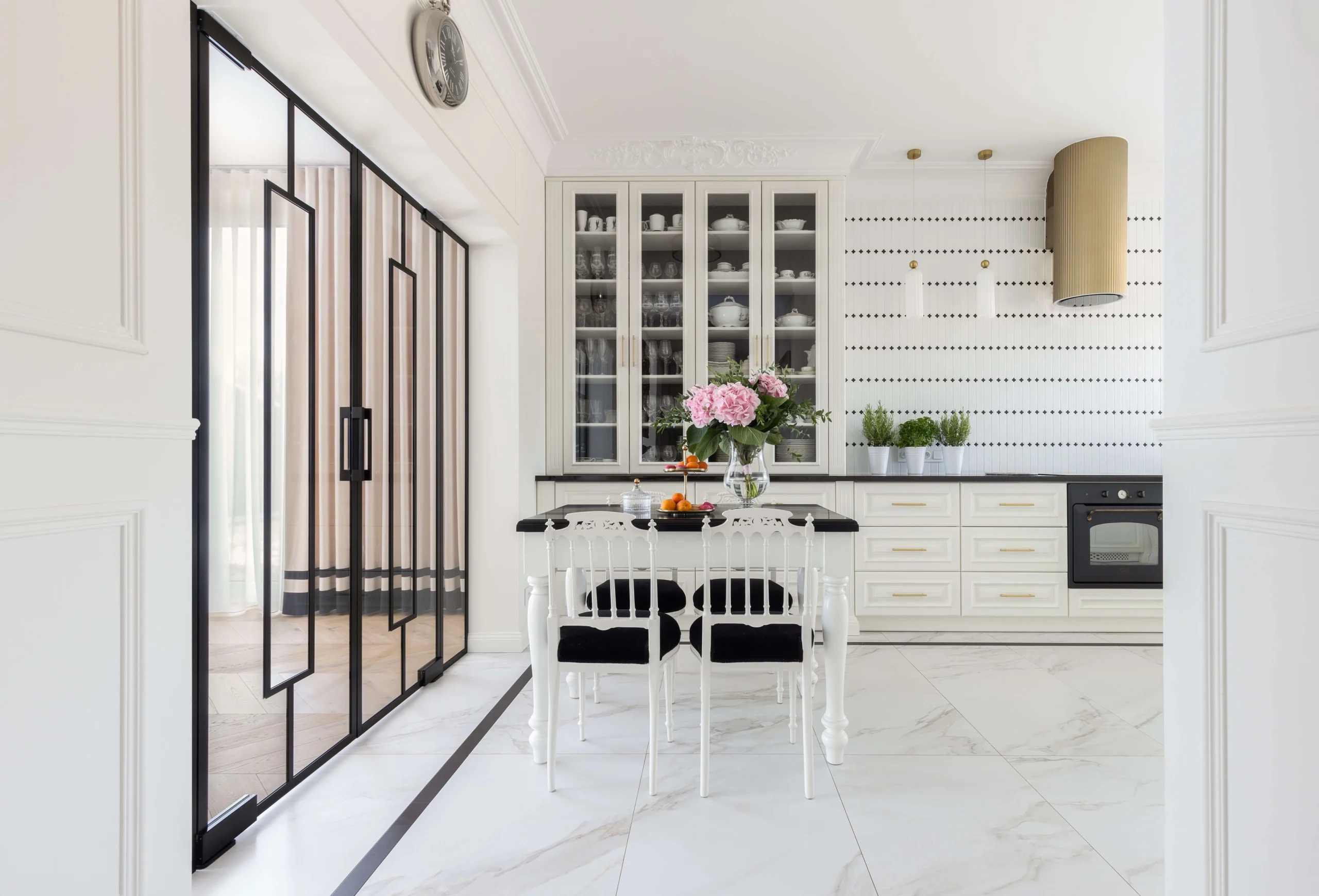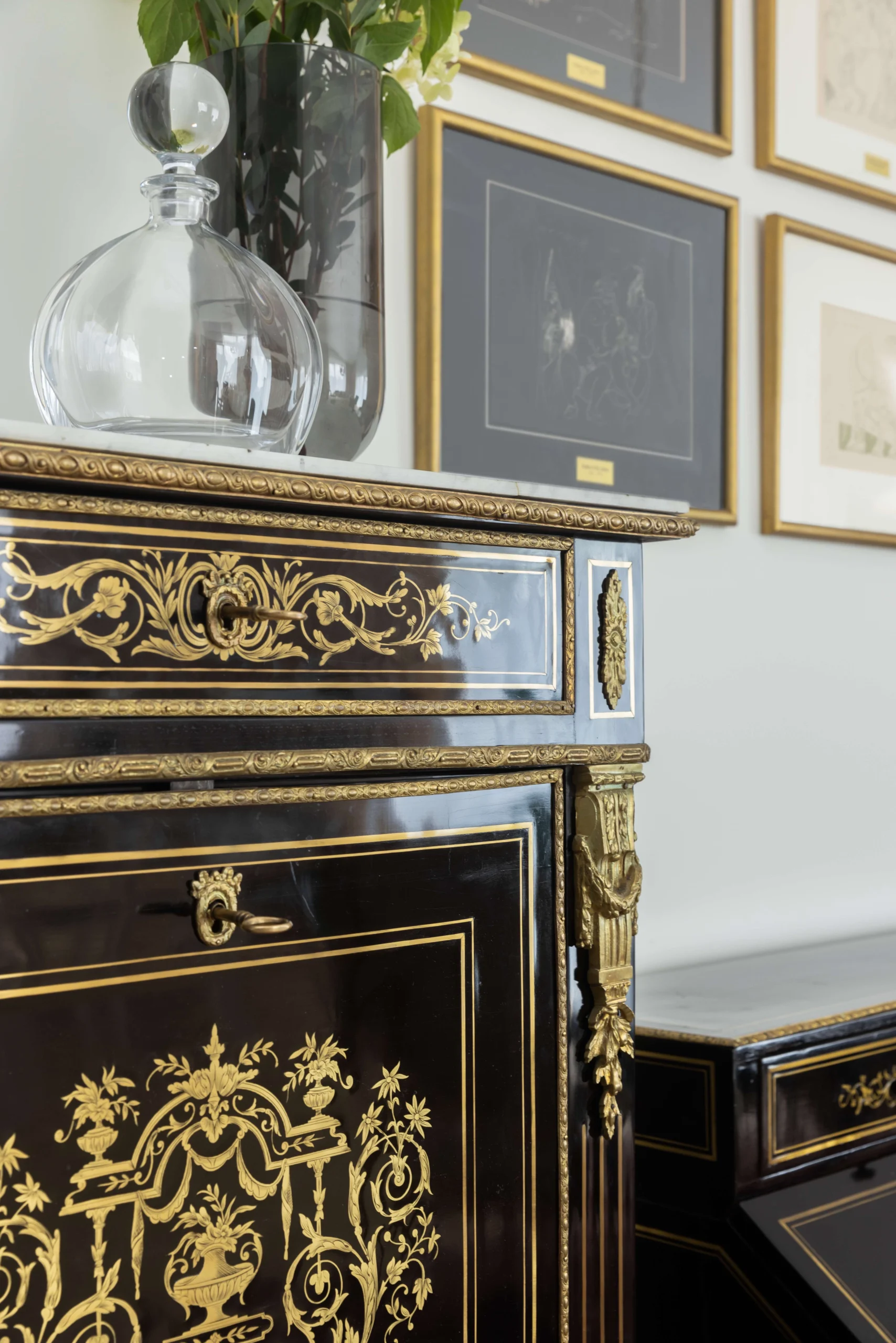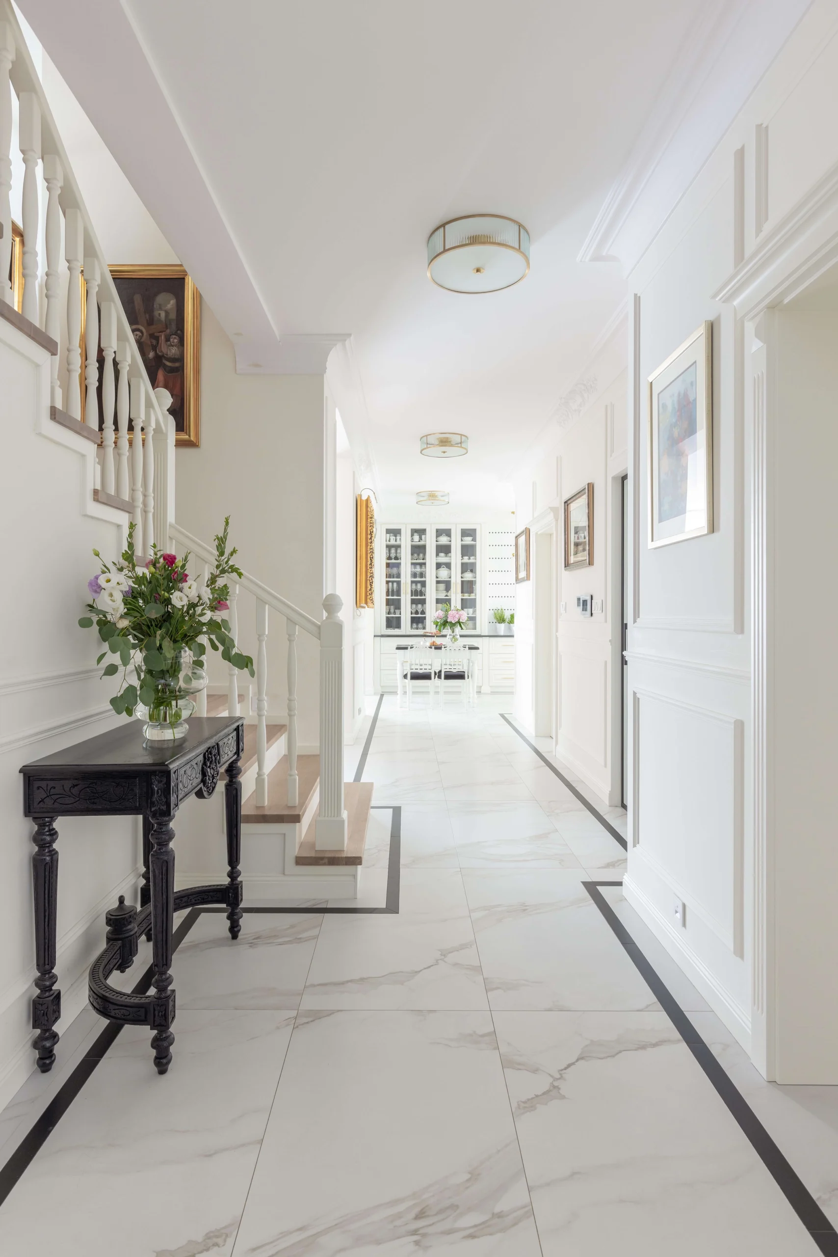 Dom kolekcjonera sztuki, w którym całe wnętrze zostało zaprojektowane w klasycznych odcieniach czerni i bieli, harmonijnie współgrających z zabytkowymi meblami i dziełami sztuki. Każdy element przestrzeni jest starannie dopasowany, podkreślając elegancję oraz wyjątkowy charakter unikatowej kolekcji właściciela.