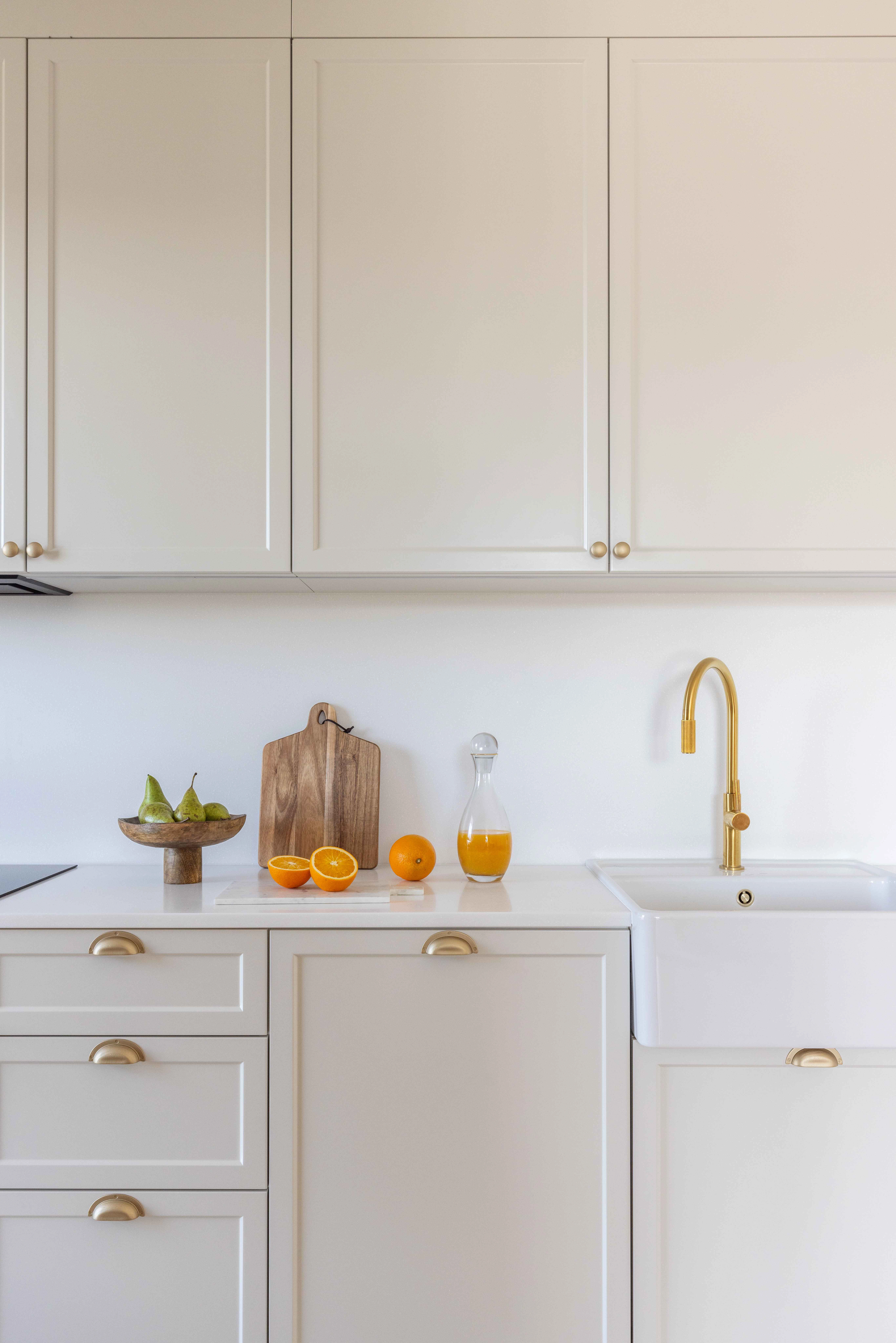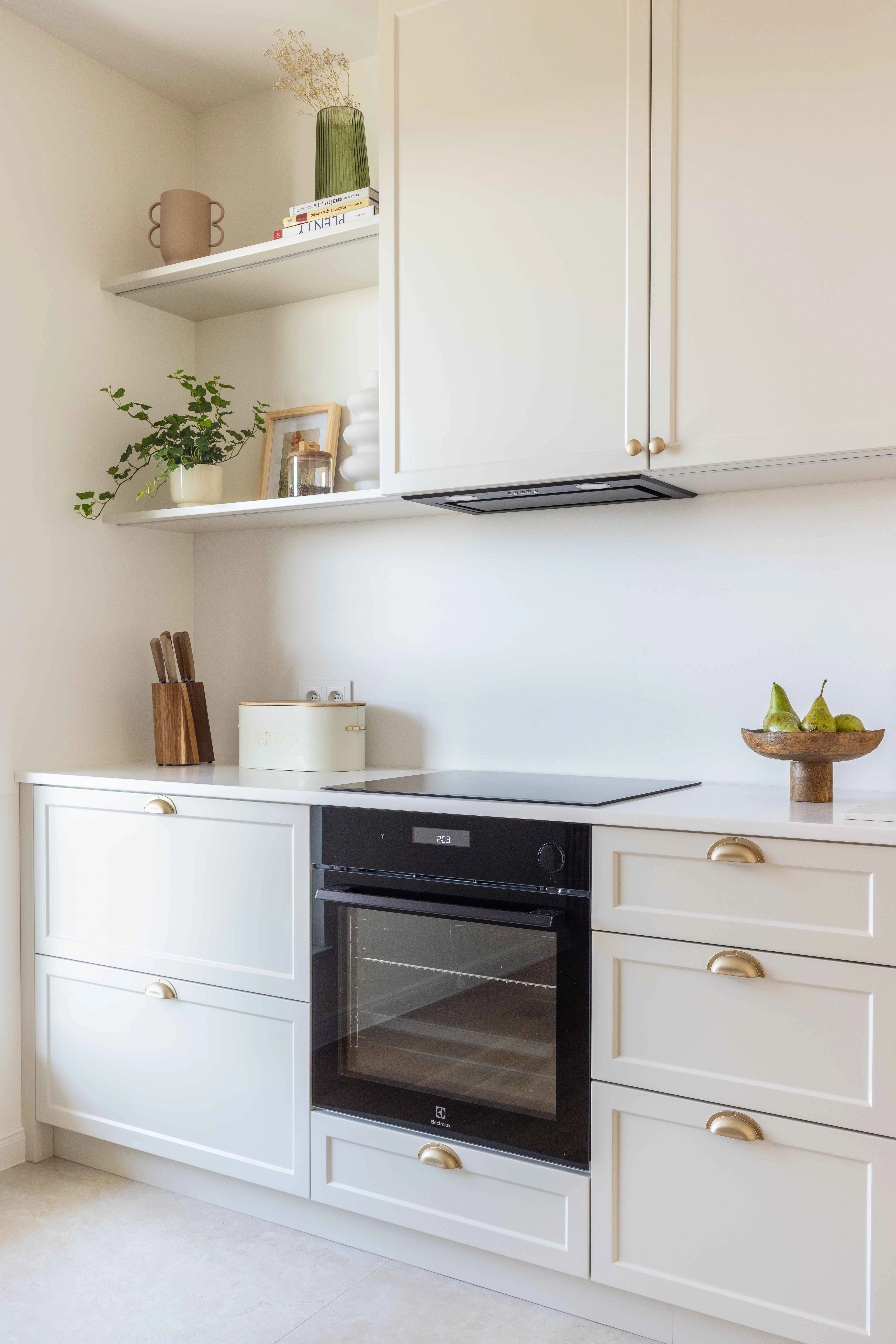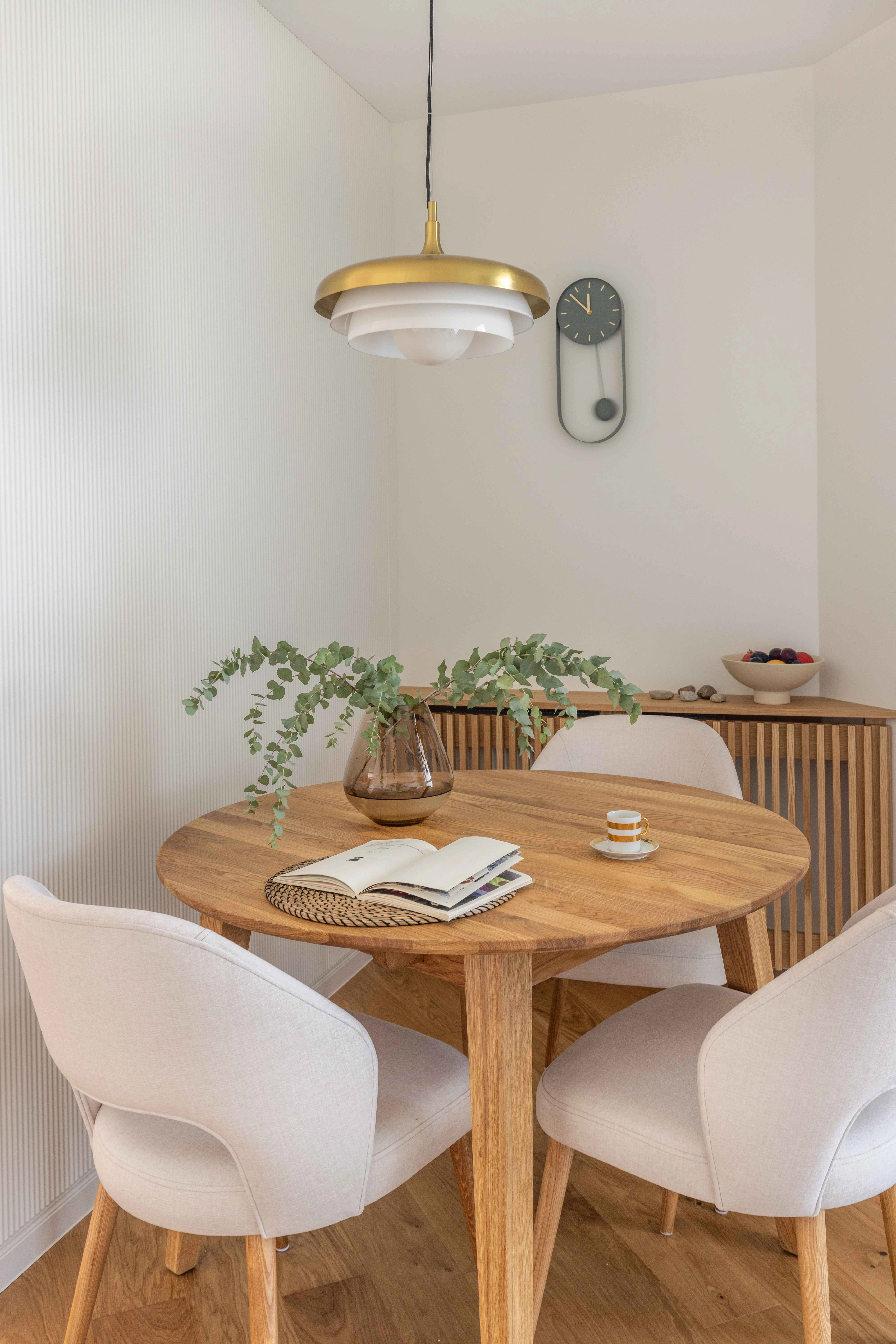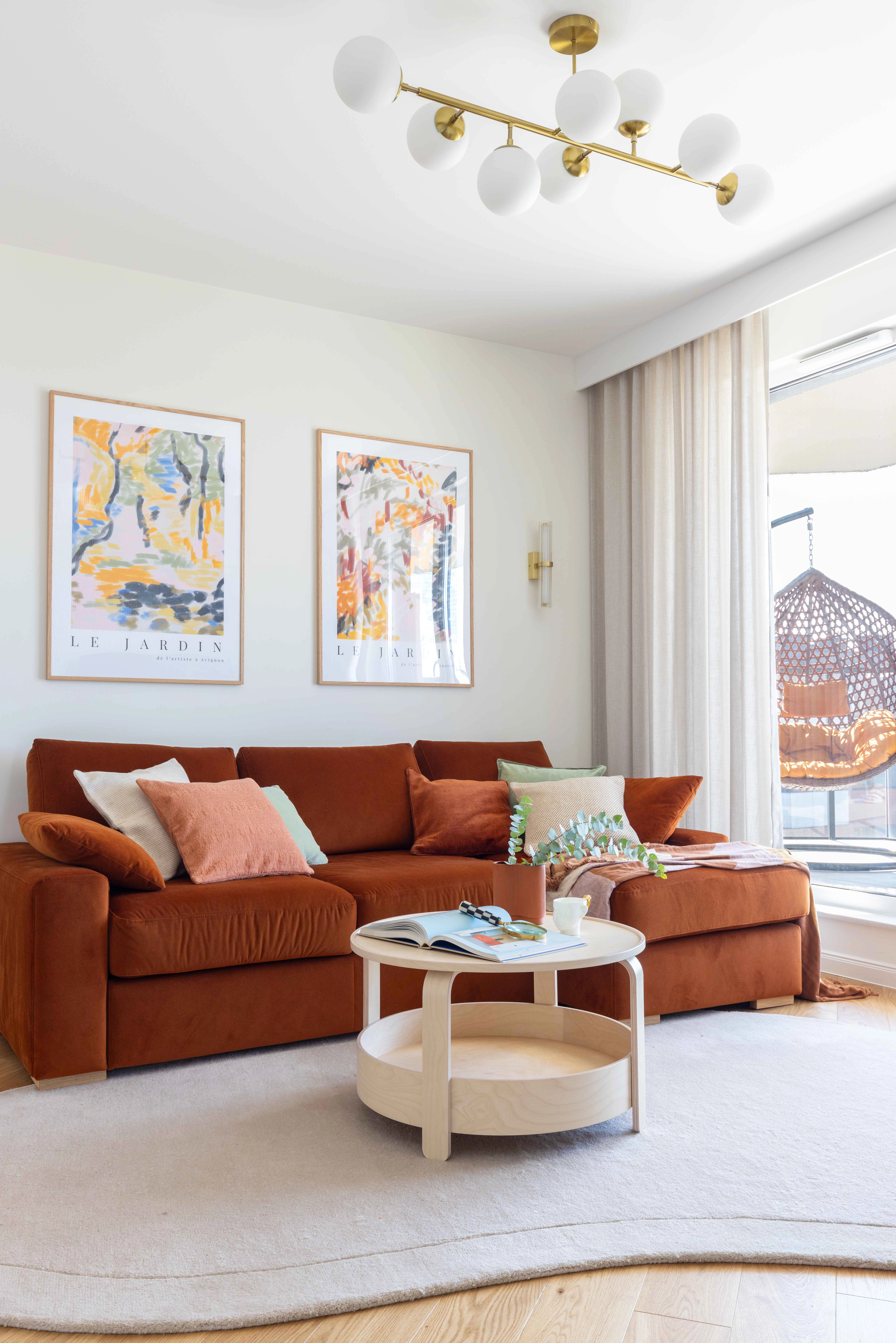 Mieszkanie wymagało szczególnej uwagi przy planowaniu, ponieważ miało nietypowy, wielokątny plan. W ramach optymalizacji przestrzeni zamieniliśmy toaletę na funkcjonalną garderobę z pralnią. Założeniem było stworzenie przytulnej przestrzeni, dlatego mieszkanie zostało zaprojektowane w odcieniach beżu, z subtelnymi akcentami zieleni i pomarańczu.